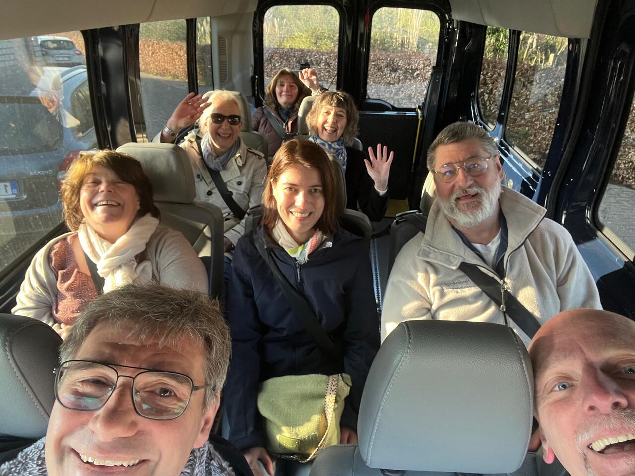 Met hun aprilvisjes in een doosje toeren de collega's van de administratie met het busje van De Rusthuif van Arendonk naar Ravels en langs Oud-Turnhout weer naar Arendonk.