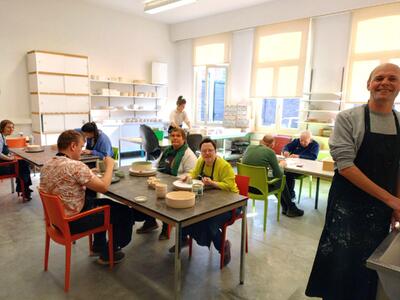 Als teambuilding bezoeken de collega’s van de administratie enkele afdelingen waarvoor zij vanuit de hoofdzetel in Turnhout een stuk van de administratie in orde brengen. Met het busje van De Rusthuif starten zij hun toer in Arendonk richting Ravels voor een bezoekje aan De Boomgaard. Heel fijn om te zien hoe het creatief talent van de cliënten van het Keramiek atelier resulteert in prachtig en uniek keramiek. Iedereen is verwonderd over de originaliteit, kwaliteit en schoonheid van hun keramiek. Petje af!