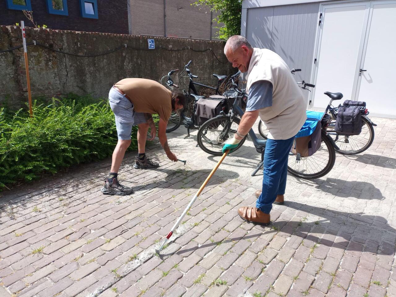 Francis en Danny verwijderen met veel ijver en kracht het onkruid tussen de klinkers van Mekanders.