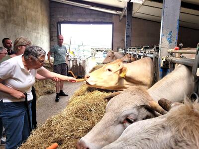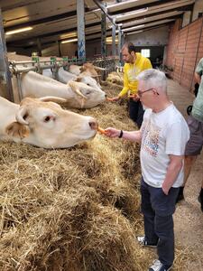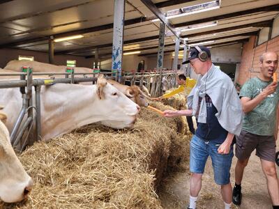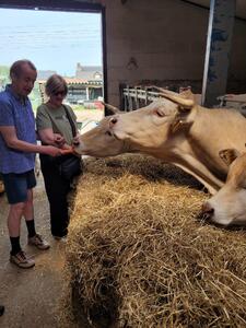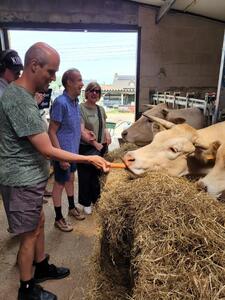 Toen onze buikjes rond waren, kregen we een rondleiding langs de dieren van de boerderij. Eerst zagen we konijntjes en kippen, daarna een varken bijna zo groot als een koe. Klaas, Kitty en Benny gingen ook in het hok van de mama-schapen met hun lammetjes. De kleintjes kwamen allemaal naar Klaas en mama-schaap riep heel luid “Bèèèèèèuuuhhhhh” in Klaas zijn oor. Na de schaapjes volgden Maria haar favorieten: de koeien. Die hadden grote honger en wij mochten hen wortels geven. Superleuk! Als laatste zagen we de biggetjes die in de modder rolden.