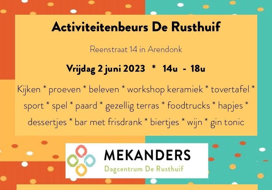 Van 14u tot 18u kan je op De Rusthuif komen kijken, proeven, beleven en nog zoveel meer. Er is een workshop keramiek. Je mag de tovertafel uitproberen. Doe mee met sport, spel en paard. Op het gezellig terras geniet je van een drankje, hapje of dessertje van de foodtrucks.